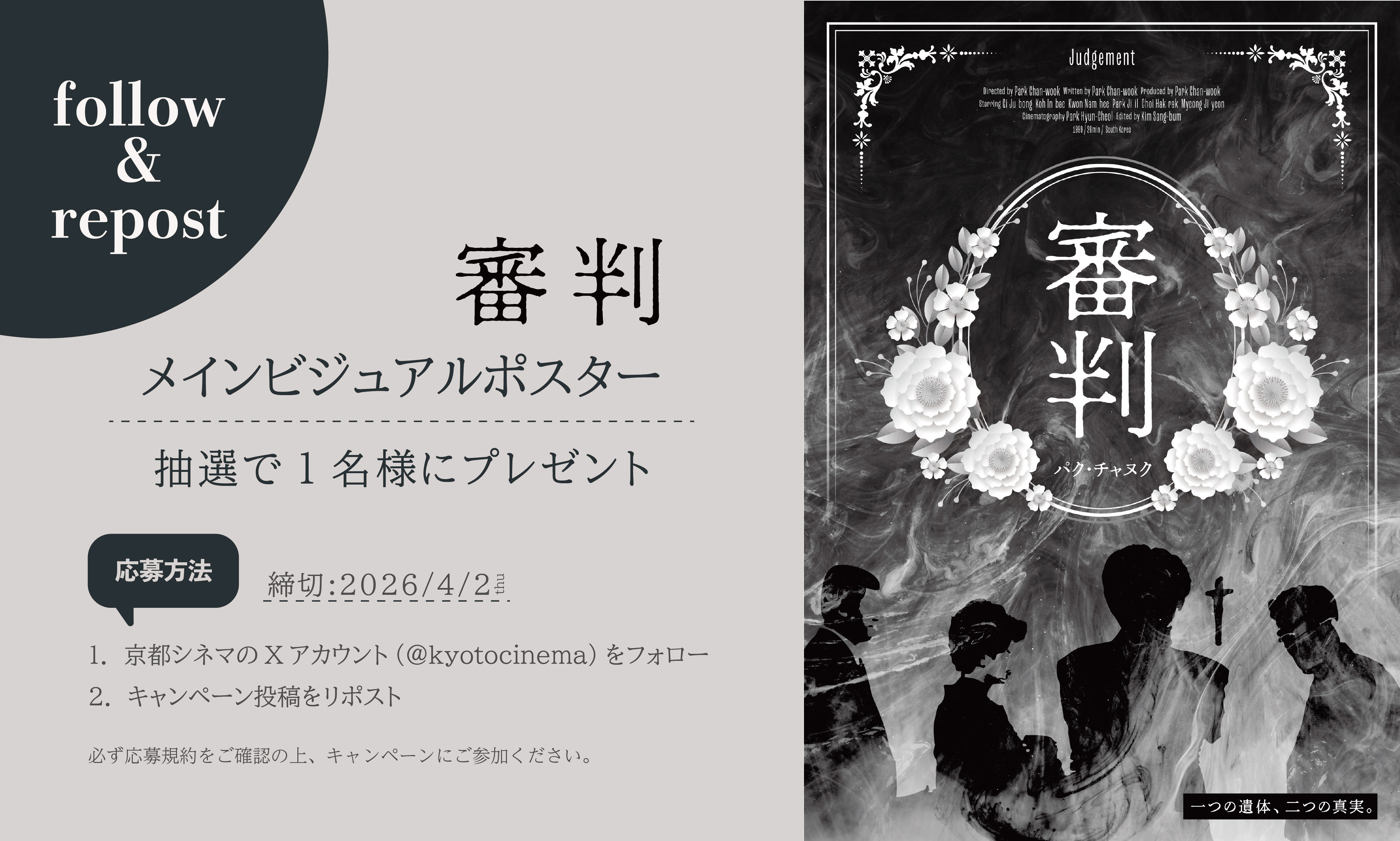京都シネマのXアカウントをフォローしてキャンペーン投稿をリポストすると、抽選で1名様へ『審判』のメインビジュアルポスター(B2サイズ/非売品)をプレゼントいたします。