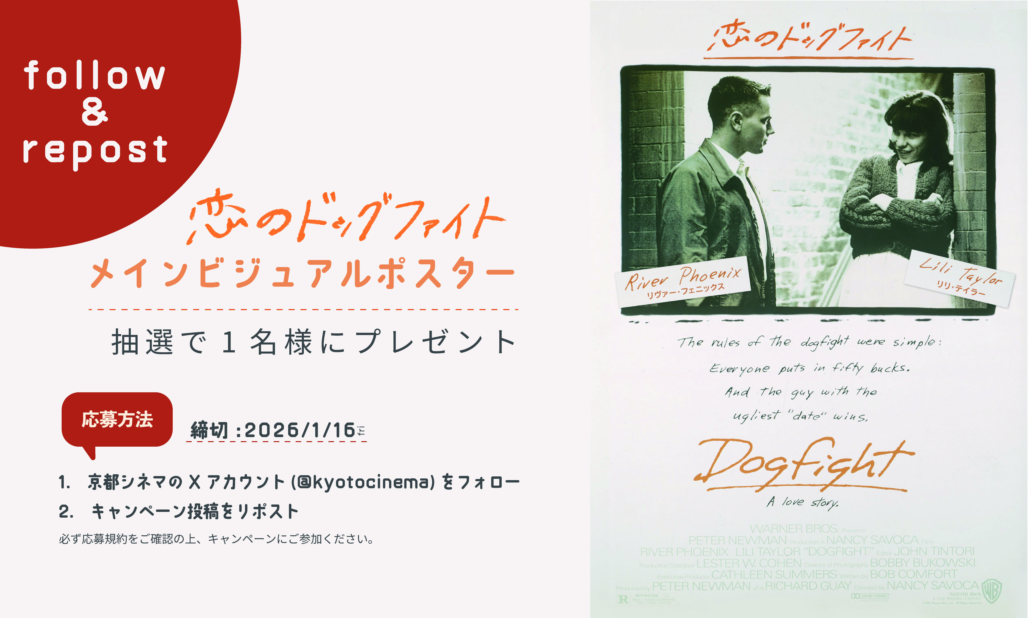 京都シネマのXアカウントをフォローしてキャンペーン投稿をリポストすると、抽選で1名様へ『恋のドッグファイト』のメインビジュアルポスター(B2サイズ/非売品)をプレゼントいたします。